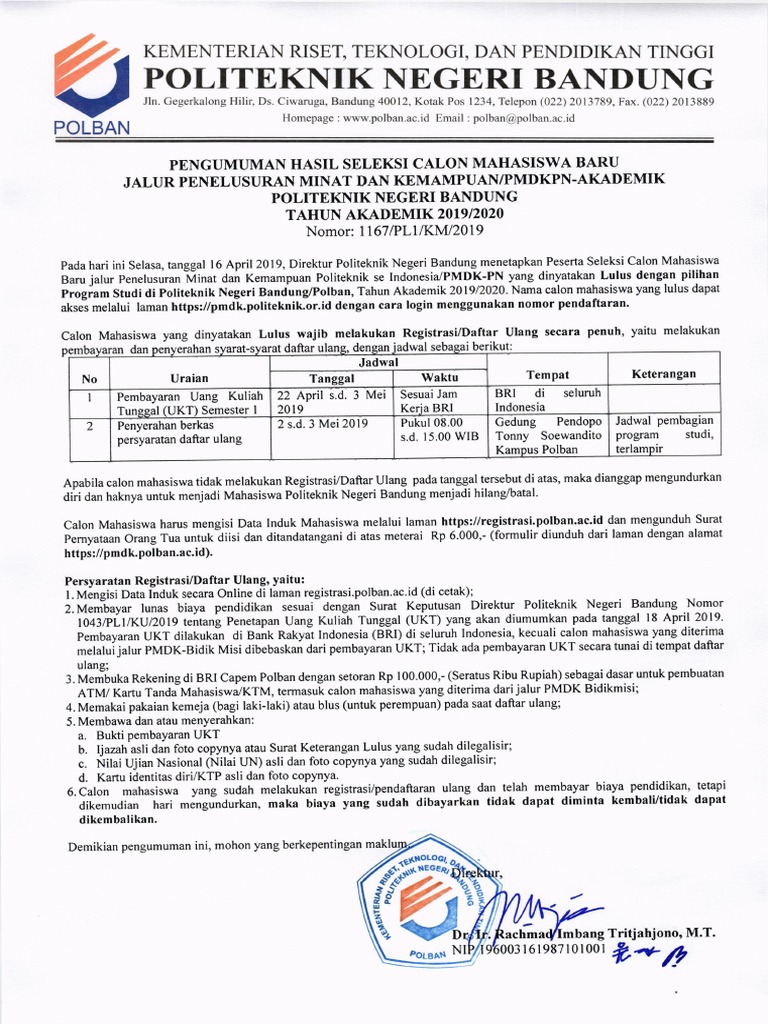 Passing grade politeknik negeri bandung. Sejak tahun 1999, politeknik itb menjadi. Pendaftaran snmpn di polban terbagi menjadi 2 yaitu snmpn akademik dan snmpn bidikmisi. Contohnya passing grade ui pasti berbeda dengan passing grade milik ugm, unpad, undip, ataupun itb. Organisasinya telah berkembang pesat, yaitu telah memiliki 10 jurusan, 38 program studi yang terdiri dari 18 program studi jenjang diploma iii, 18 program studi jenjang diploma iv, dan 2 program studi jenjang magister terapan.