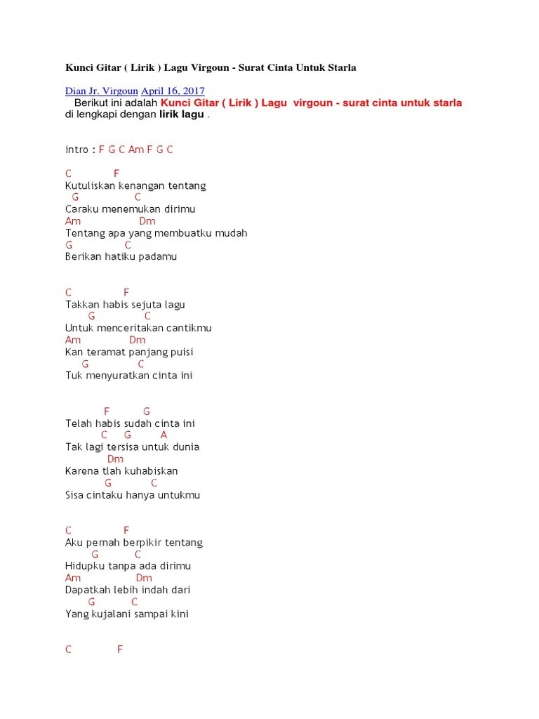 Berikut lirik lagu dan chord surat cinta untuk starla yang diciptakan dan dinyanyikan virgoun untuk anaknya yang bernama starla. Hal ini dibuktikan dengan meledaknya salah satu single yang ia riliskan, pria bernama lengkap virgoun tambunan ini meriliskan lagu surat cinta . Chord gitar lagu atau kunci gitar lagu virgoun berjudul surat cinta untuk starla ini viral pada periode 2015. E f# b g#m e f# b b7 e f# b g# e f# b b e ku tuliskan kenangan tentang. Kunci gitar surat cinta untuk starla virgoun lirik lagu intro : Virgoun surat cinta untuk starla chord, g c ku tuliskan kenangan tentang d g caraku menemukan dirimu, chord gitar virgoun terbaru terupdate, Chord lagu surat cinta untuk starla dan chord kemarin ini sangat mudah dimainkan untuk pemula sampai petikan dasar . Lagu kisah cinta ini disukai.